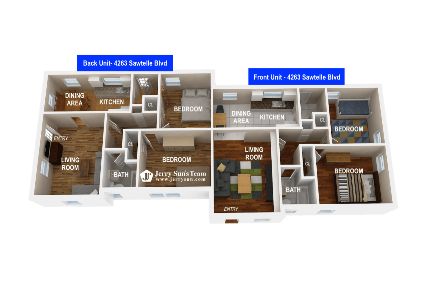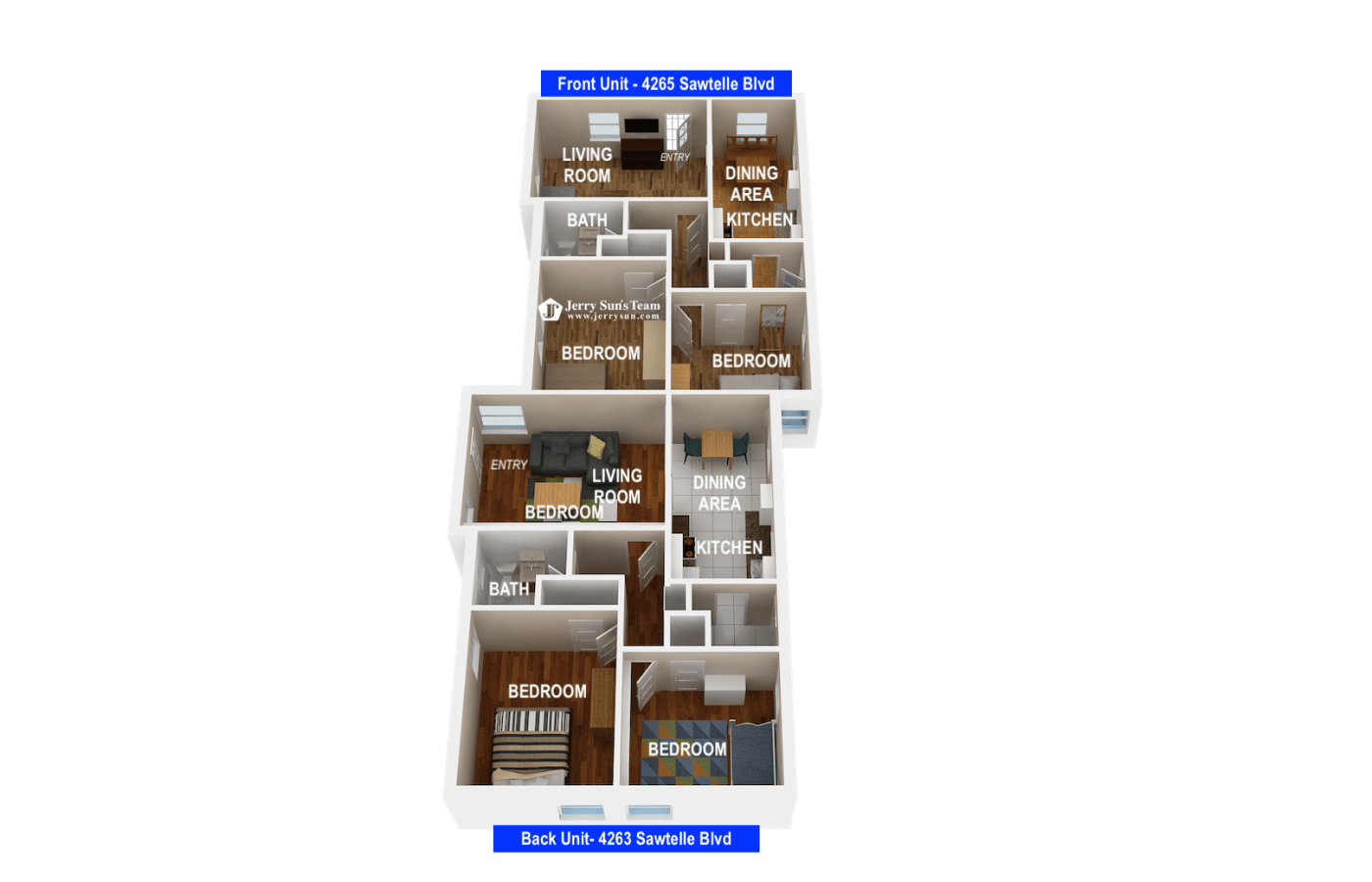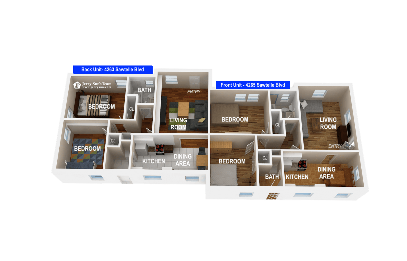 This duplex sits on a 5,393 square foot lot. It features a total of four bedrooms and two bathrooms, combining for 1,610 square feet of living space. It has two separate electric meters, two gas meters, and one water meter. All the tenants are on month-to-month leasing agreements. There is a two-car carport for parking and a long driveway capable of accommodating additional parking. Both units also feature laundry hook-up, and there is also an optional coin-operated laundry room connected with an additional storage room in the private backyard.