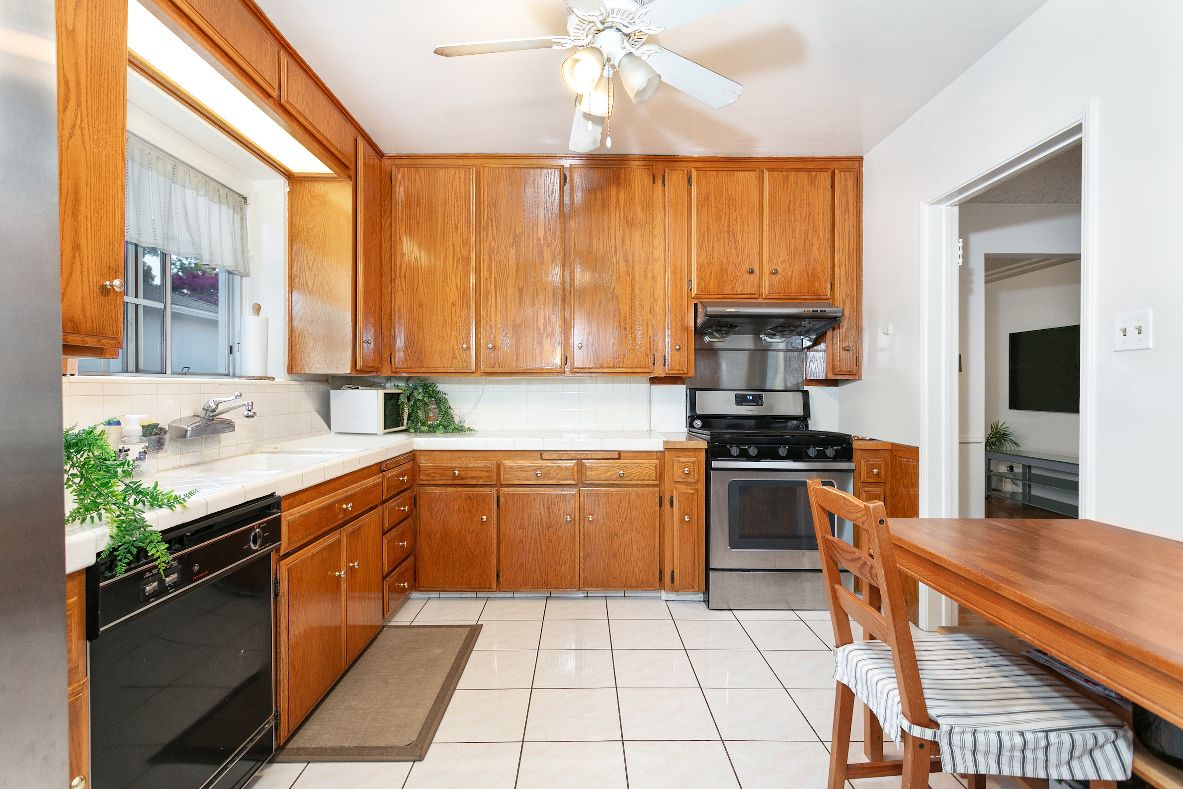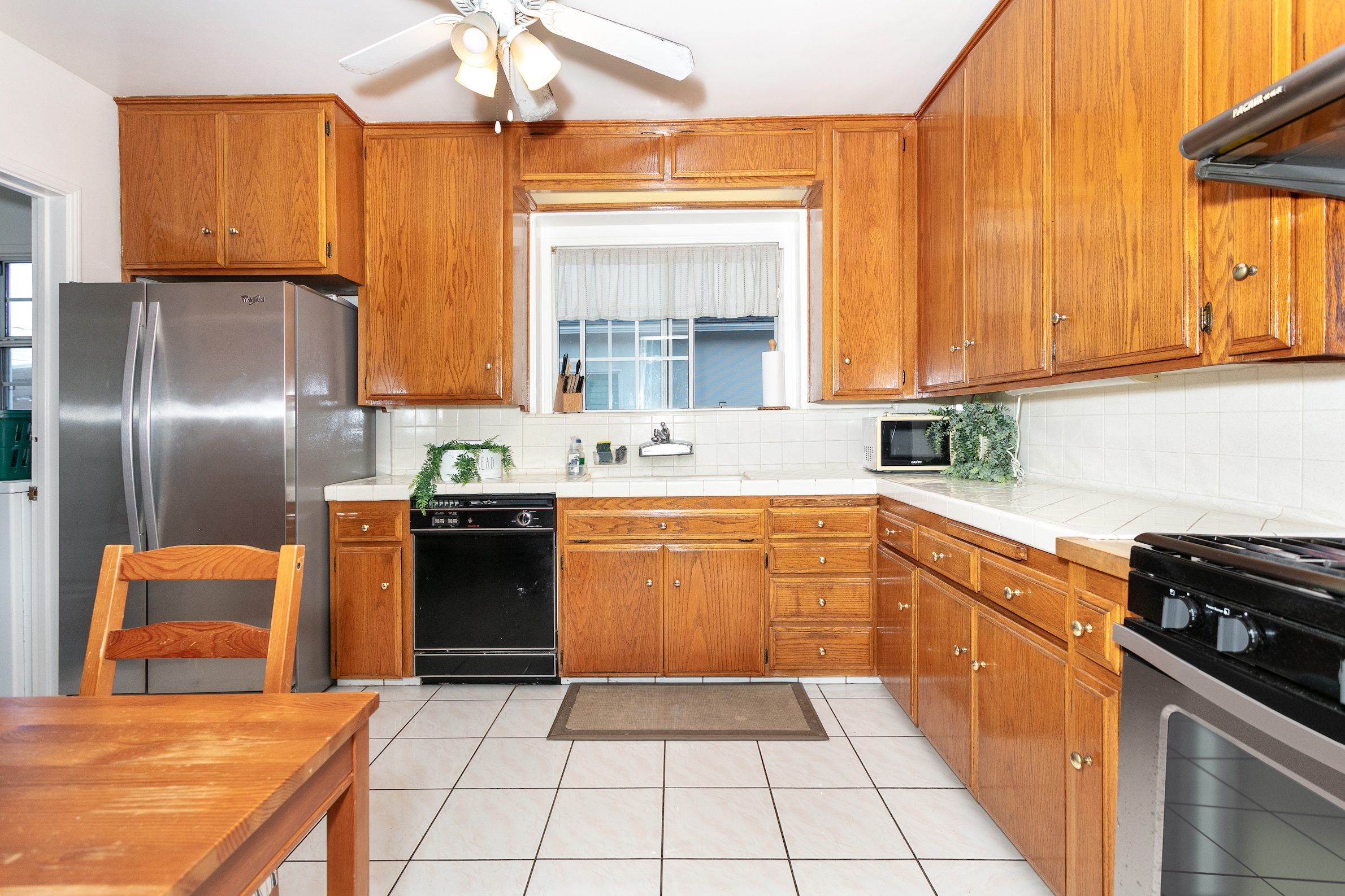 This gourmet kitchen offers ample cabinetry, ceramic tile countertops, a ceiling fan, and easy-to-maintain tile flooring, making it well-suited for culinary enthusiasts. It is connected to the adjacent laundry room, providing seamless functionality for both cooking and household tasks.
