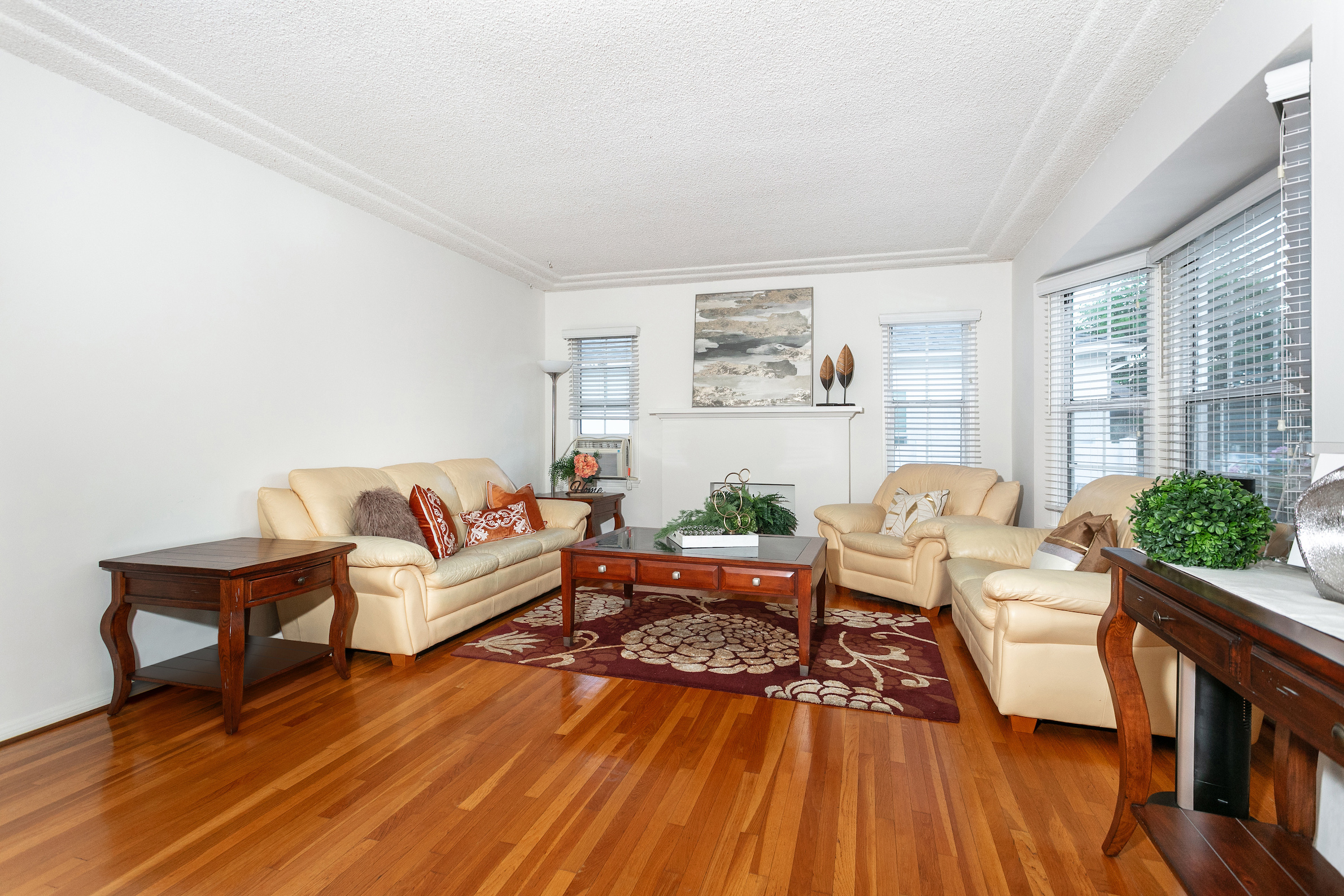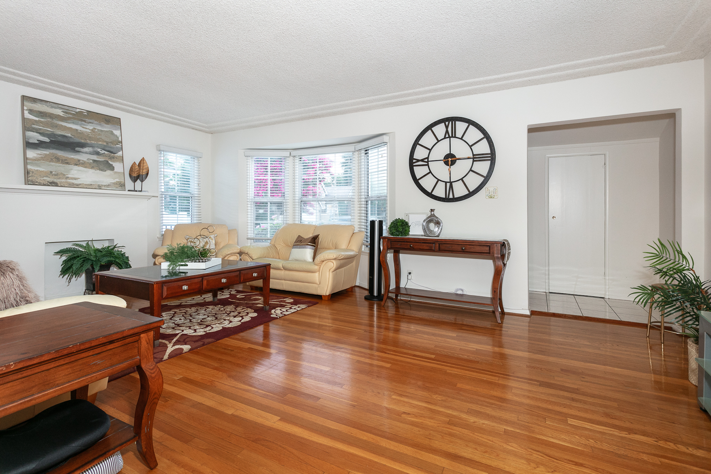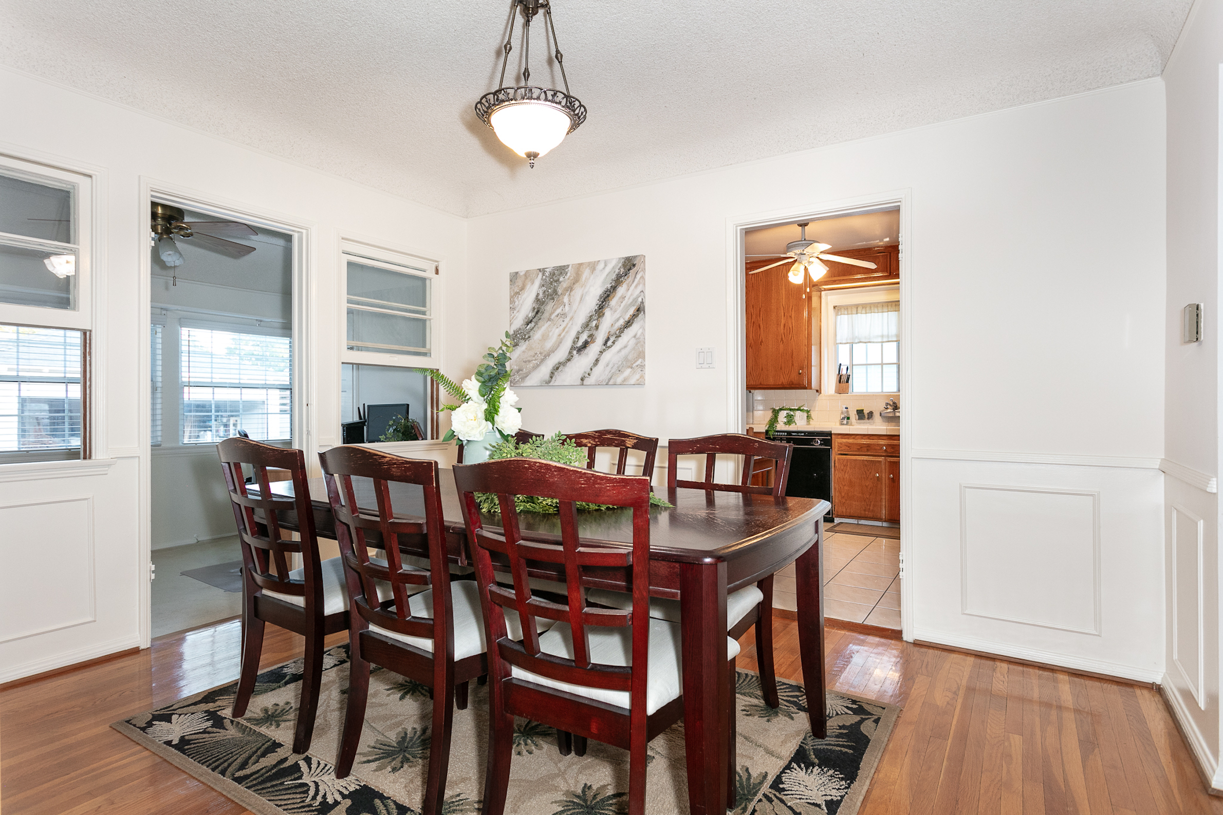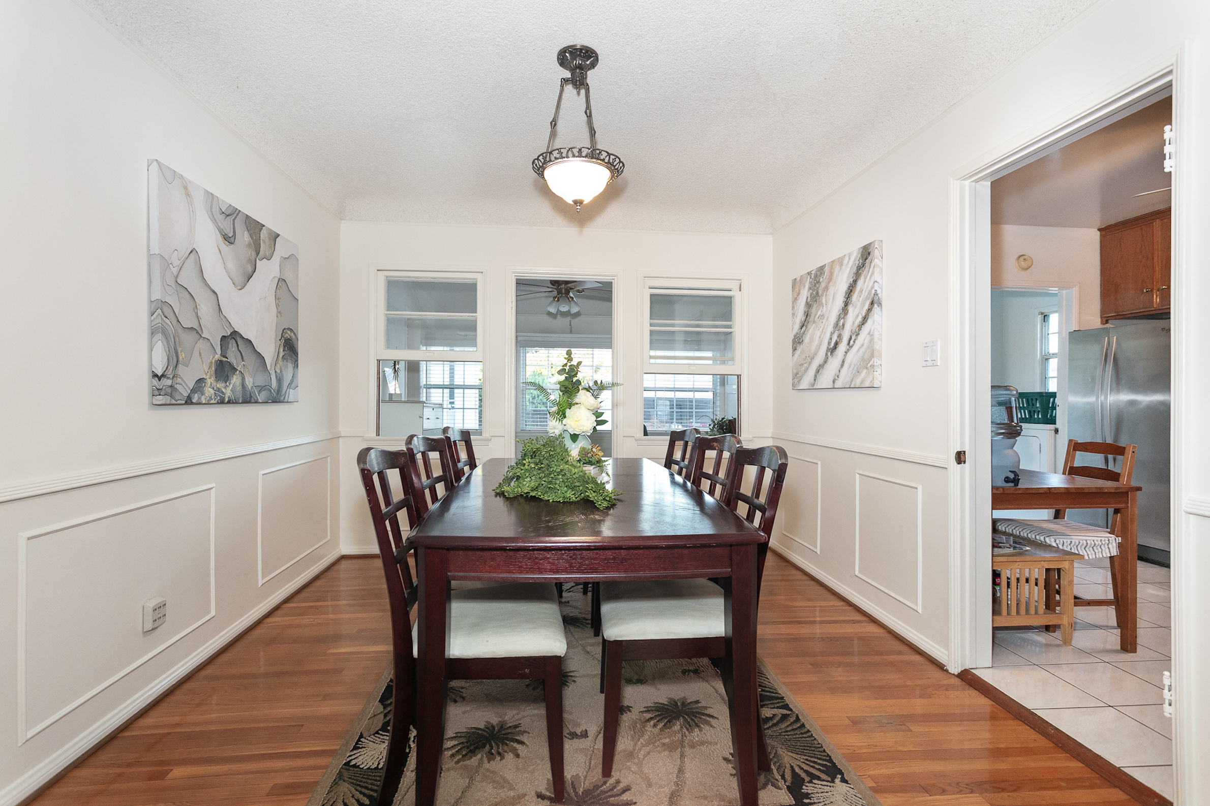 Upon entering, you'll be welcomed into a spacious living room flooded with soft natural light pouring through large bay windows and hardwood flooring throughout, crafting an inviting ambiance ideal for relaxation and gatherings. The formal dining room boasts elegant wainscoting panels, creating an inviting space for families to relish shared meals and joyful gatherings. It seamlessly extends into a light-filled versatile den with a ceiling fan, offering an ideal setting for a study room, home office, or an exercise room.