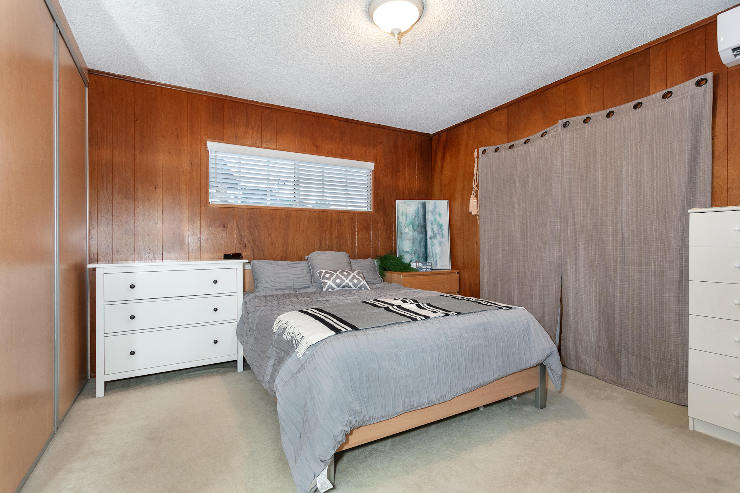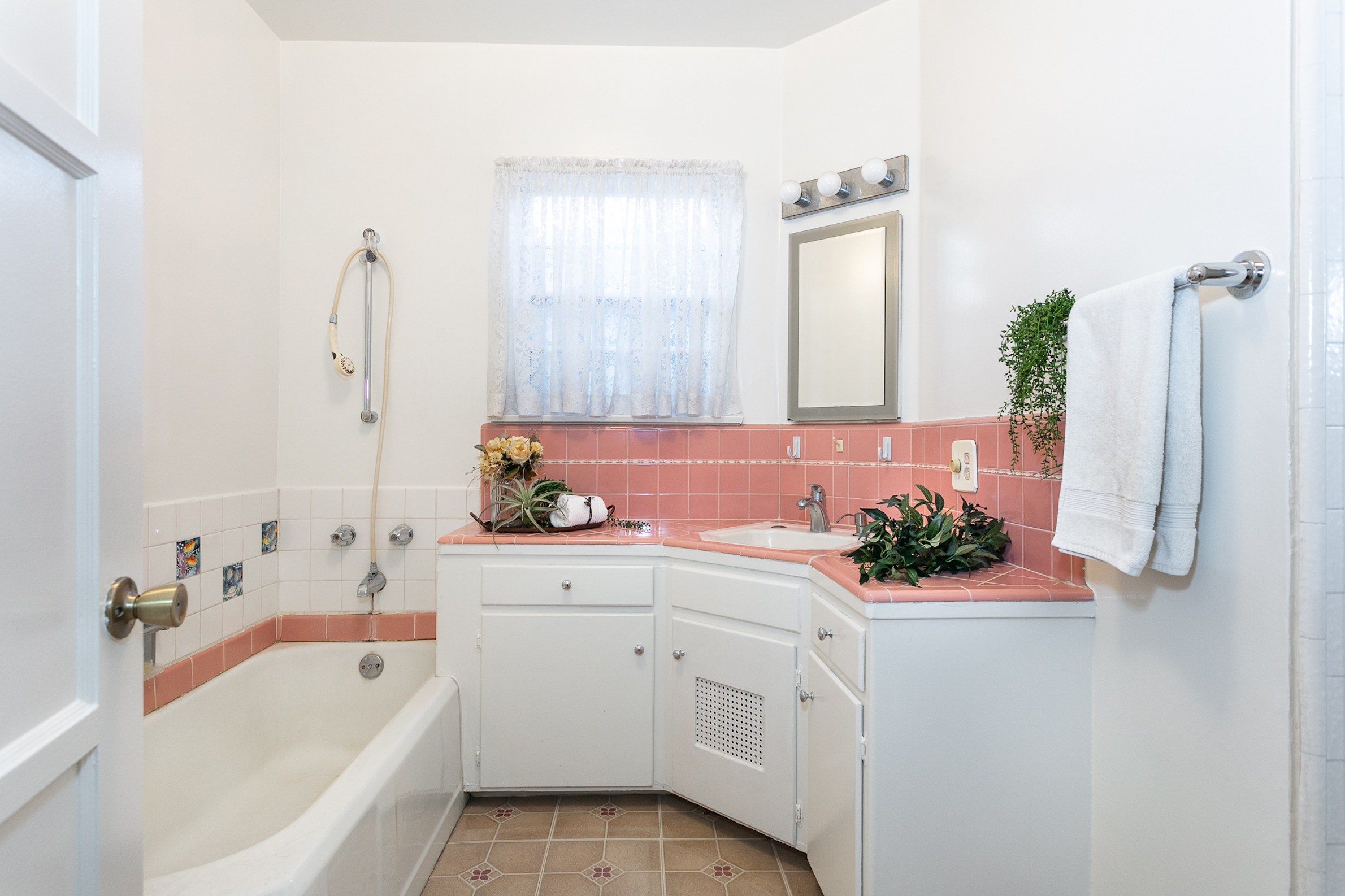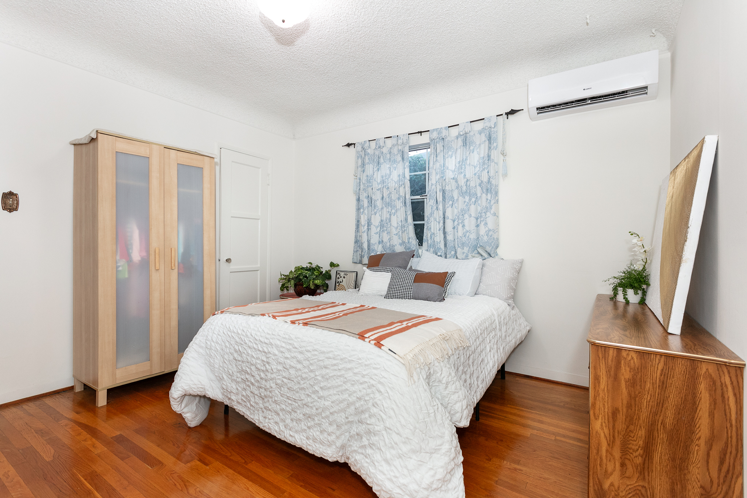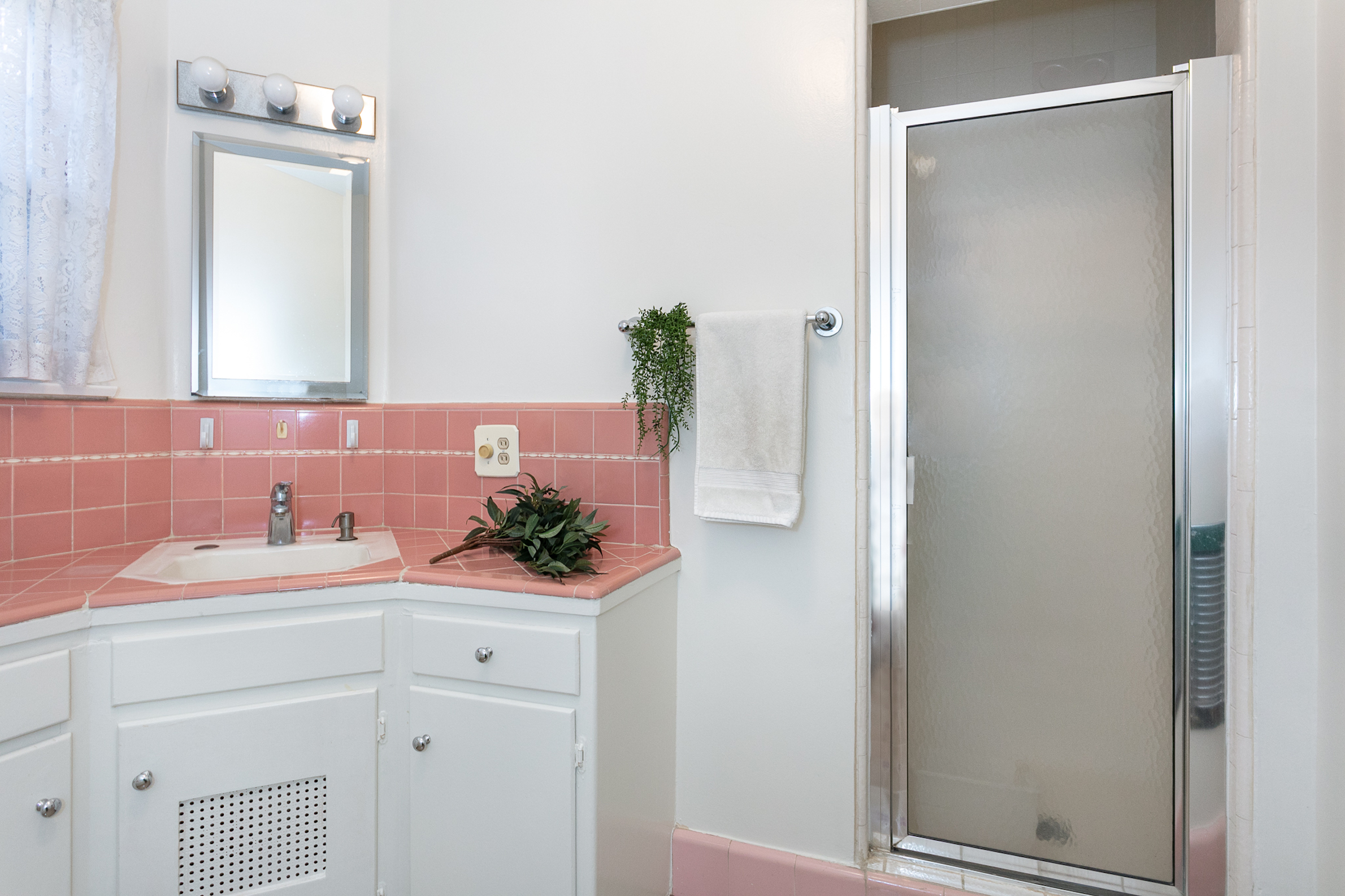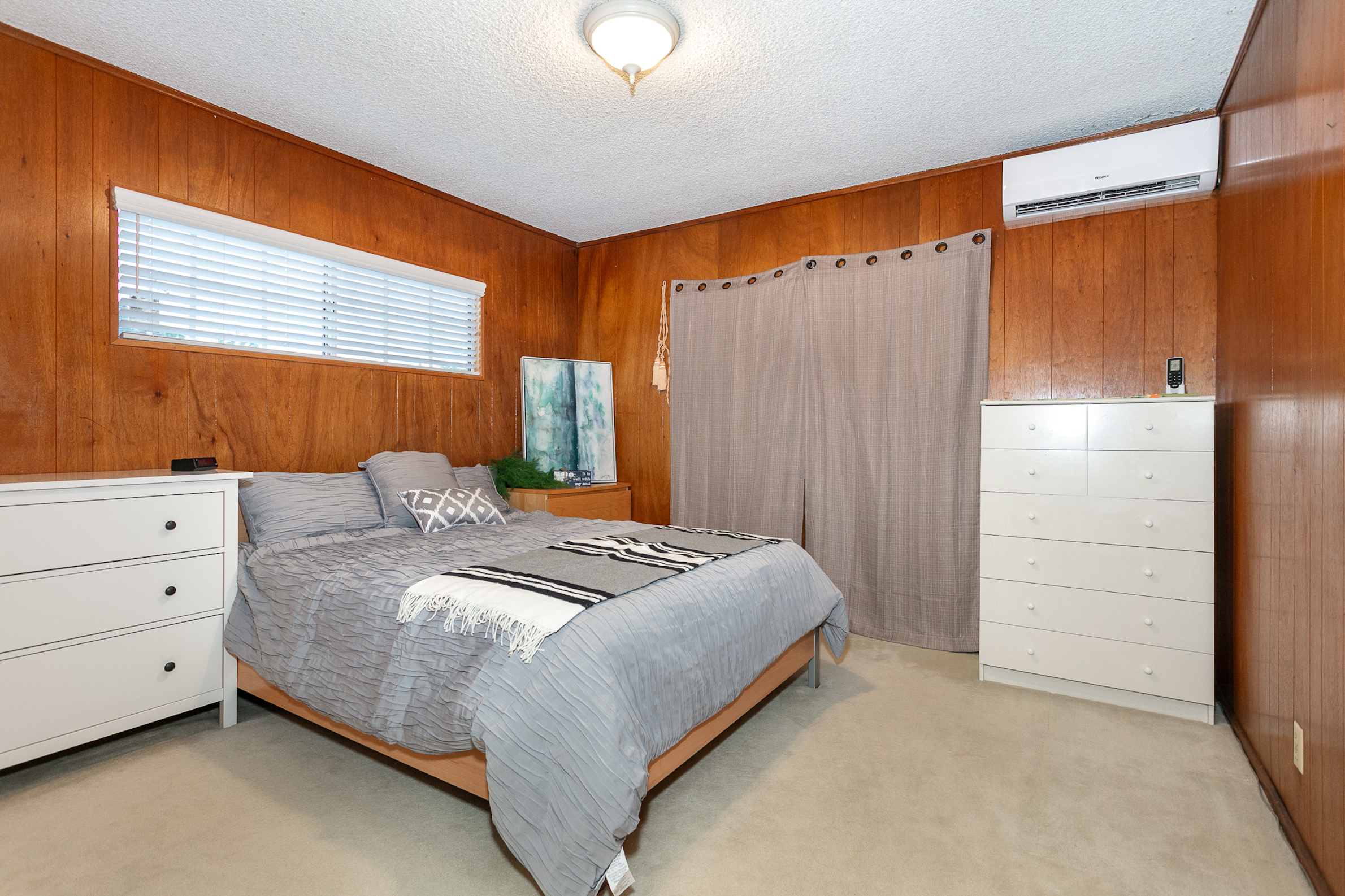The home consists of three bedrooms, each equipped with wall-unit A/C, and two full bathrooms. The first bedroom boasts wood accent wall, carpet flooring, and overlooks the backyard. The second and third bedroom has hardwood flooring throughout. The first bathroom offers a separate bathtub and shower room, tile flooring, and a rose-tinted tile vanity that brings a touch of retro-inspired allure.