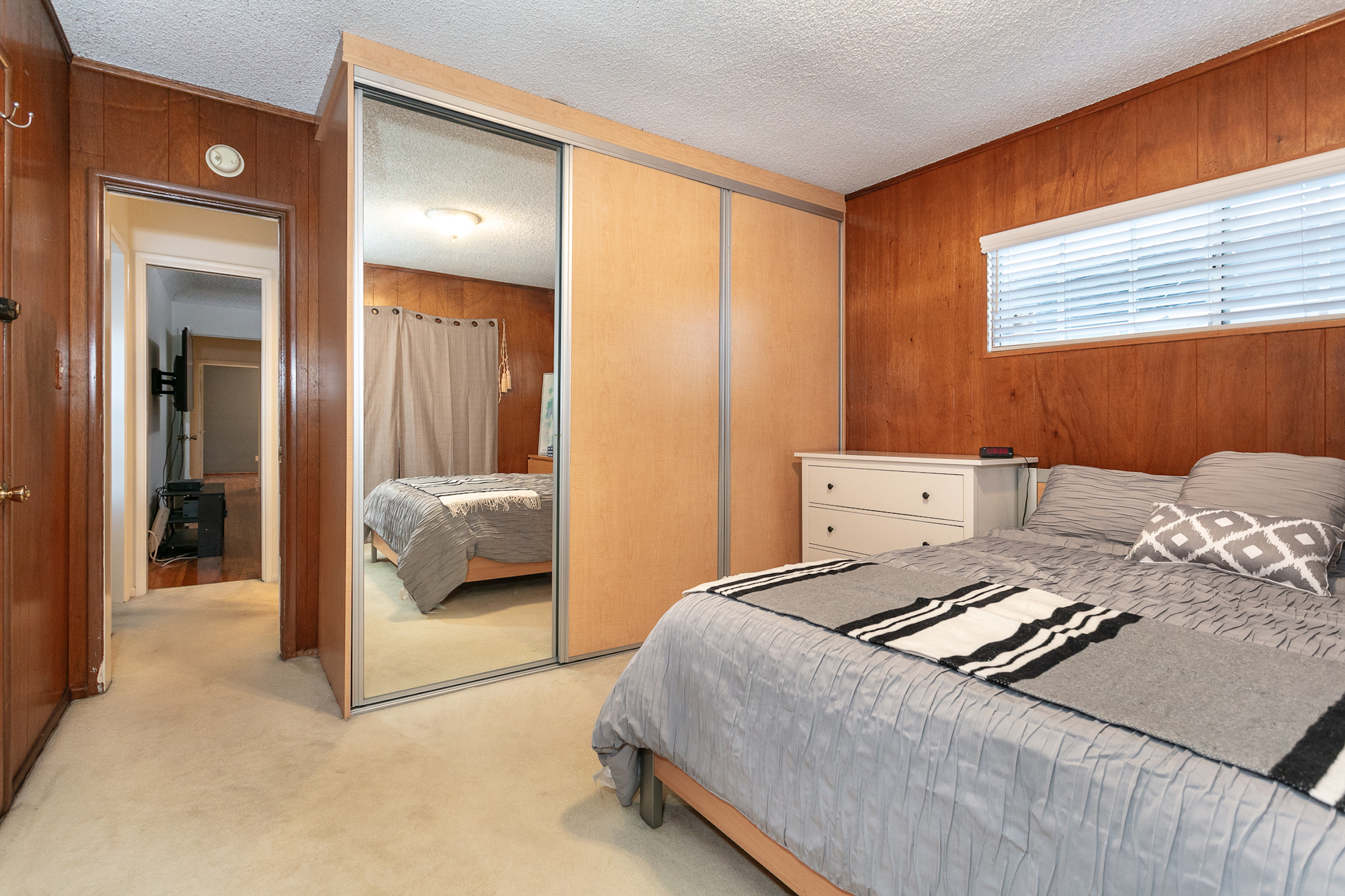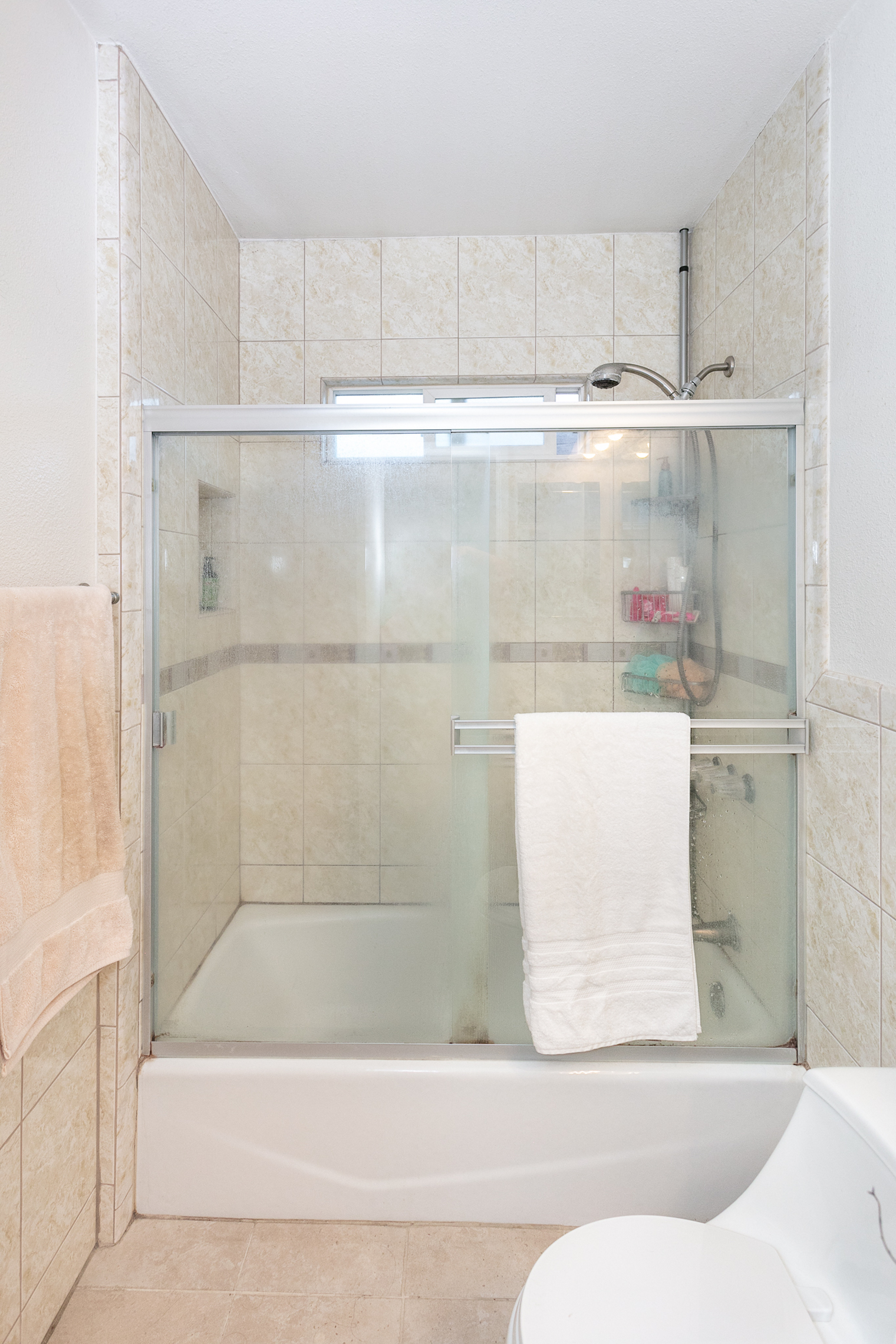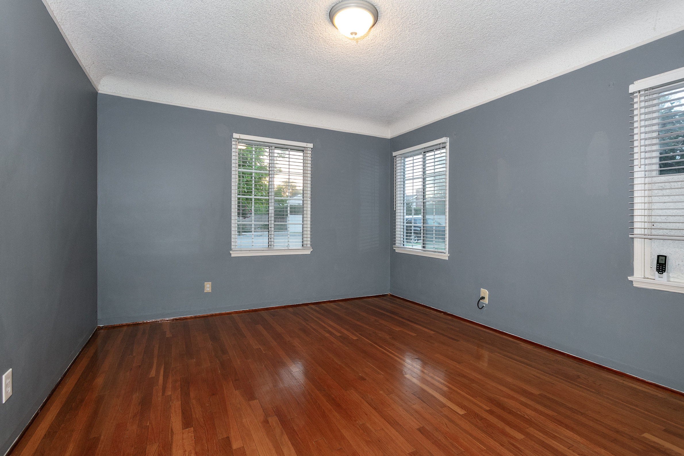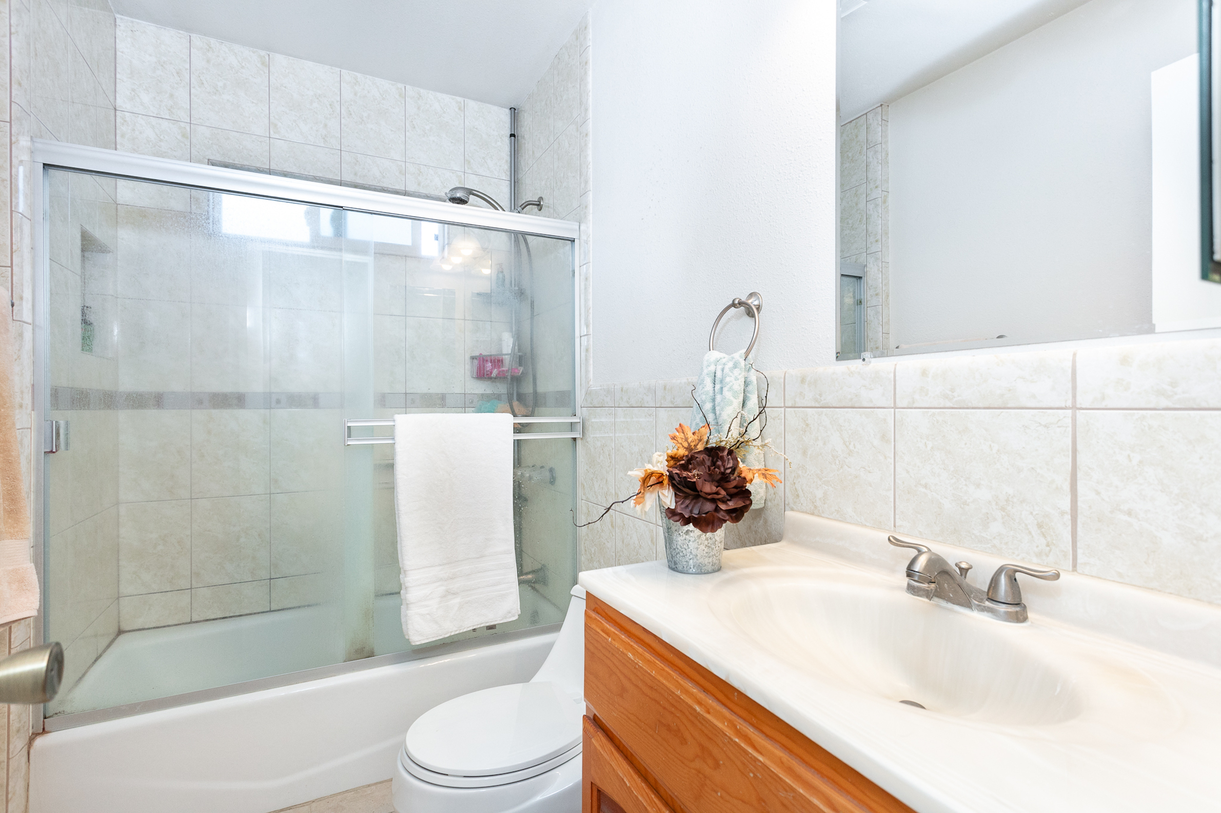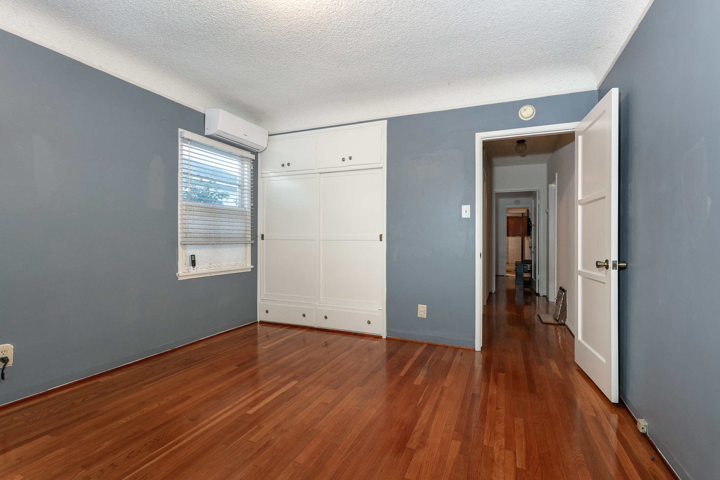 The home consists of three bedrooms, each equipped with wall-unit A/C, and two full bathrooms. The first bedroom boasts wood accent wall, carpet flooring, and overlooks the backyard. The second and third bedroom has hardwood flooring throughout. The first bathroom offers a separate bathtub and shower room, tile flooring, and a rose-tinted tile vanity that brings a touch of retro-inspired allure.