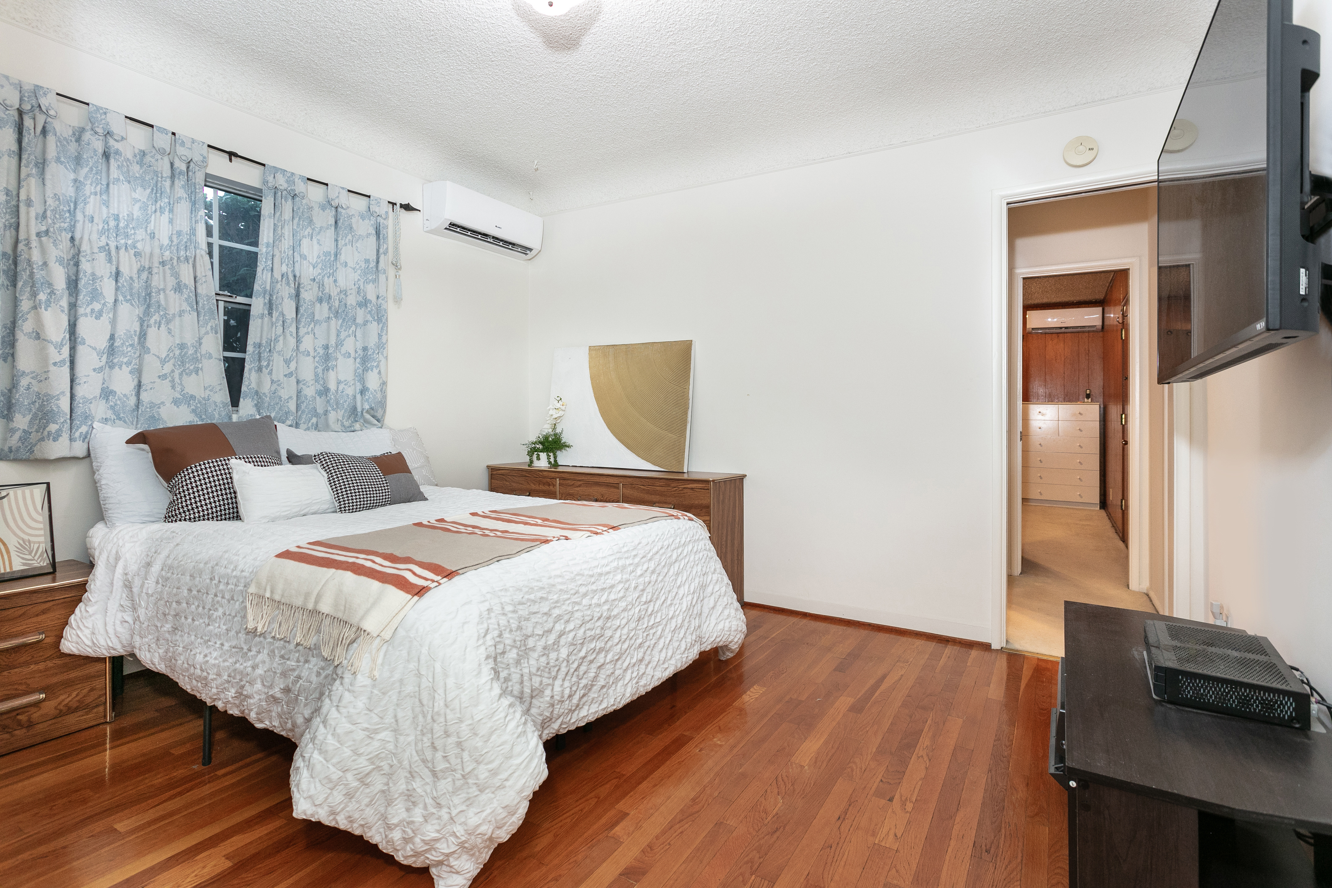 這間獨立屋共有三間臥室,每間均配備分離壁掛式空調,以及兩間完整的衛浴室。第一間臥室擁有原木裝飾牆,鋪設了地毯,並可以俯瞰後院。第二間和第三間臥室則鋪設硬木地板。第一間浴室提供了乾濕分離的浴缸和獨立的淋浴間,鋪有瓷磚地板,玫瑰色瓷磚梳妝台賦予了復古懷舊的魅力。